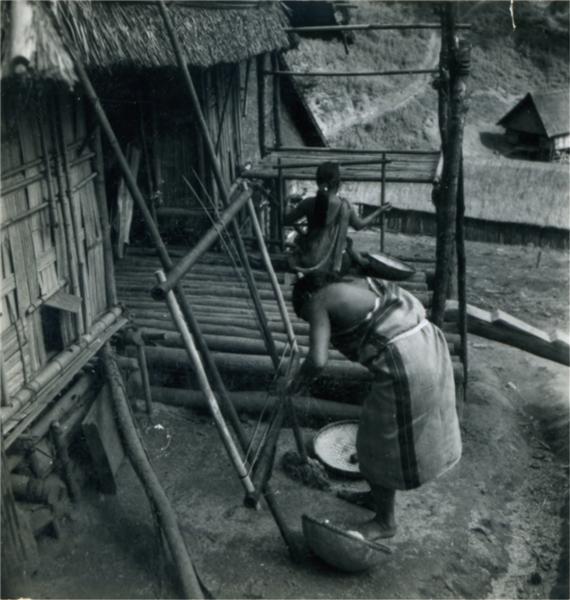 | Jeune femme penchée sur un cadre à l'extérieur d'une maison, préparant la chaîne en prévision de son tissage |