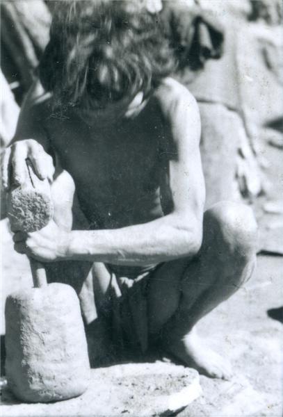 | Jeune homme accroupi perçant une boule d'argile avec le manche d'un maillet |