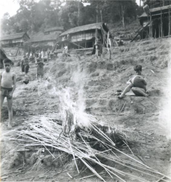 | Feu d'un tas de cannes sèches et de petit bois pour faire cuire des poteries. Au-dessus, un peit garçon et d'autres villageois plus haut dans la pente regardent la scène |