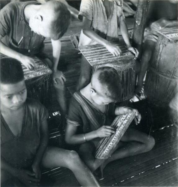 | Écoliers faisant des lignes d'écriture sur des ardoises dont certaines sont posées sur des tambours |