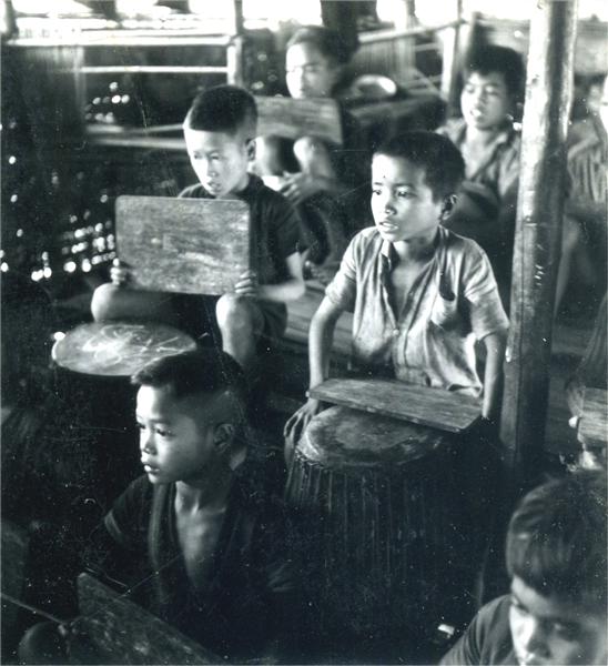 | Écoliers assis dans une classe. Des tambours leur servent de pupitres |