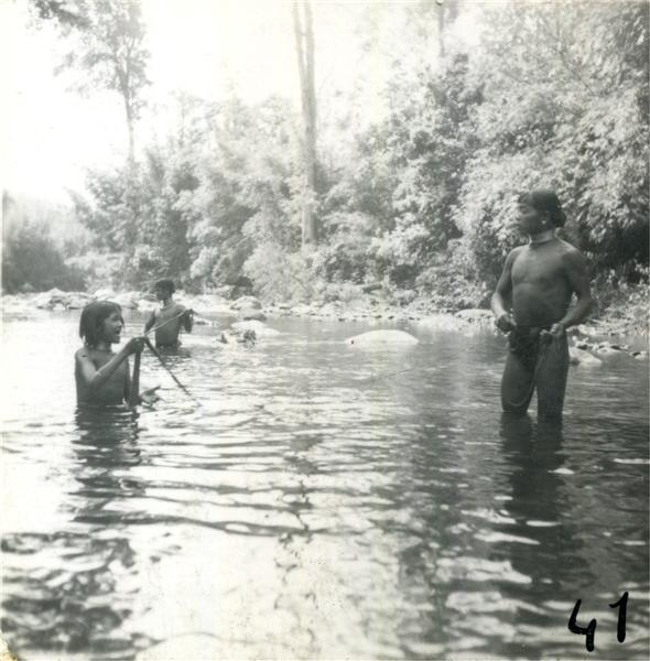 | Deux jeunes hommes dans une rivière, tenant chacun un bout d'un filet. Un peu plus loin, un autre est aussi en train de pêcher |