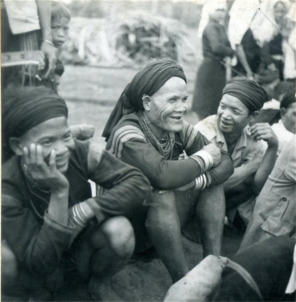 | Squatting old man sitting between two squatting young men, all wearing turbans and smiling |
