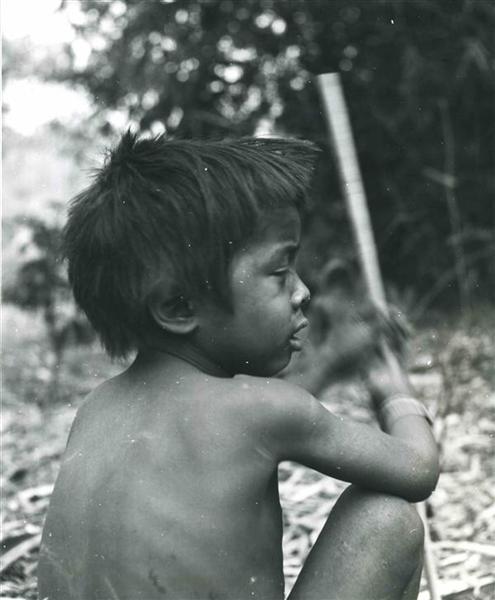 | Young boy seen from behind turning his head sideways, a stick in his hands |
