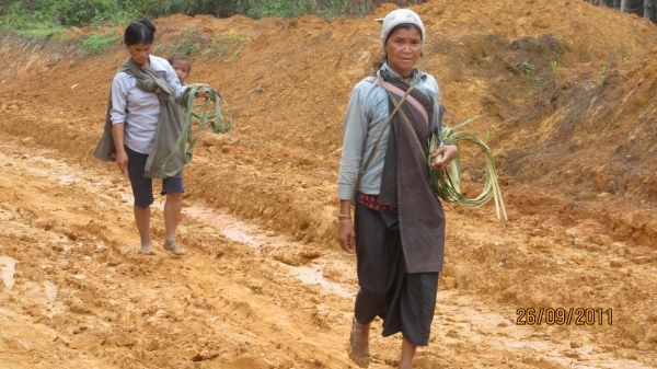 | Two women, one young and an older one walking on a road being built and leading to their village |