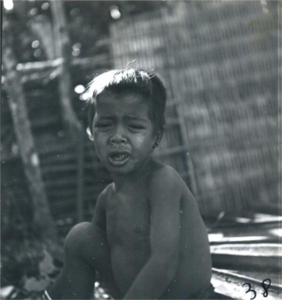 | Snivelling young boy, with an open mouth and both eyes half closed. Wood and woven bamboo partition in the background |
