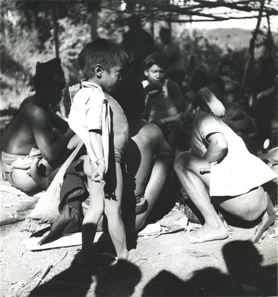 Young boy standing before squatting men during a party