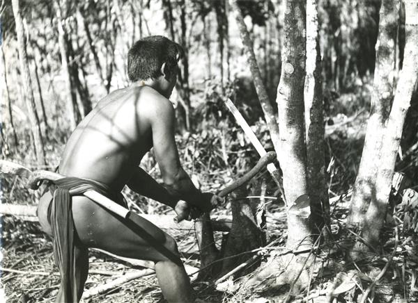 | Man cutting a tree during a clearing of a field (closer view) |