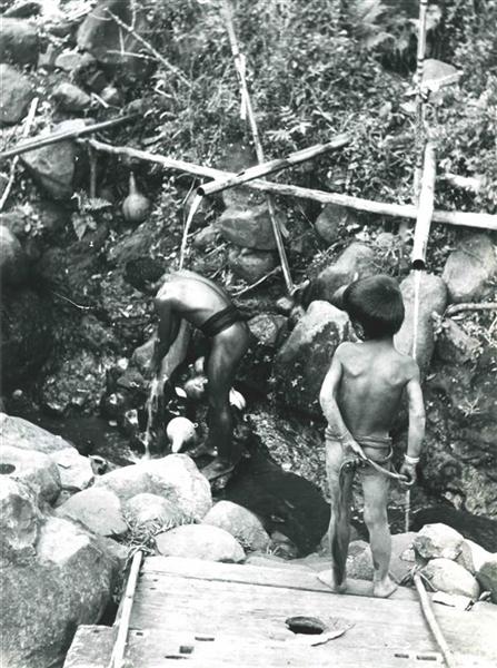 | Man bending, taking a shower under a bamboo tube pouring water, a young boy standing on a platform above him |