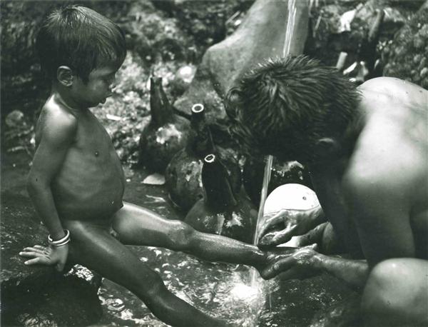 A father rubbing his son's ankle at the village water spot