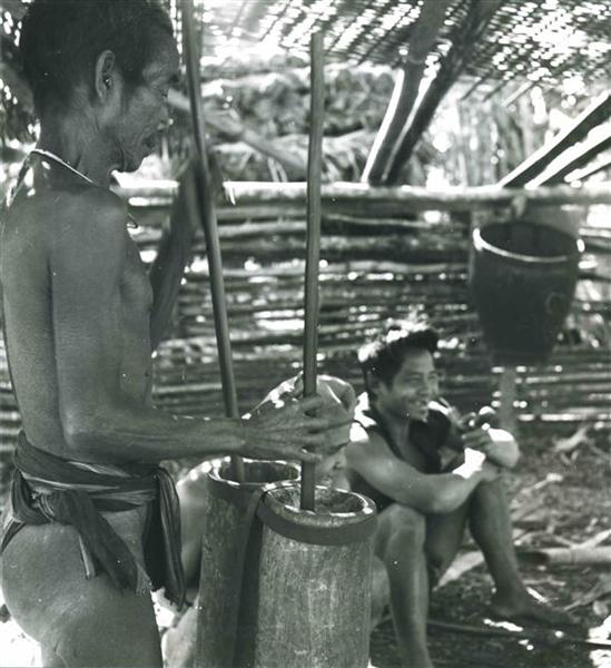 Blacksmith moving a forge's bellows. On a second row, a man smiling, holding a pipe in his hand
