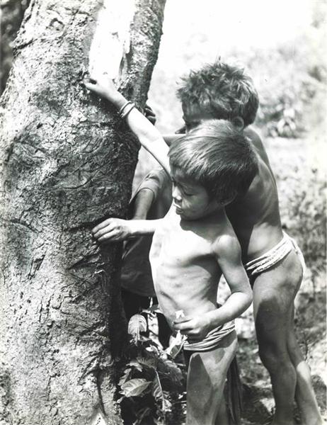 | Two young boys tearing bark off a tree |