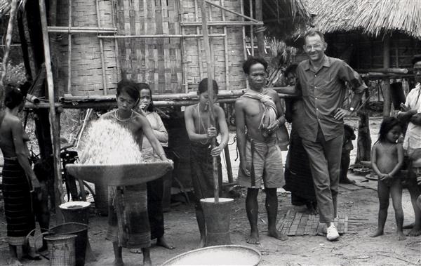 | Seven men, women and child and a white man dressed in dark clothes in a village. The white man has his right hand on the shoulder of the man in the center |