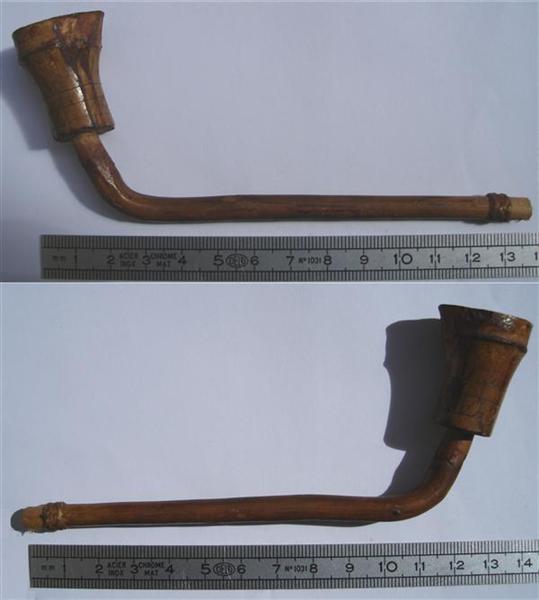 | Pipe en bambou. Fourneau légèrement incisé. Bout du tuyau renforcé par un collier tressé |
