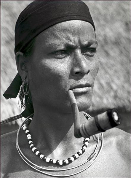 | Homme fumant sa pipe. Il fronce les sourcils et porte un serre-tête et des colliers autour du cou (vue du buste) |