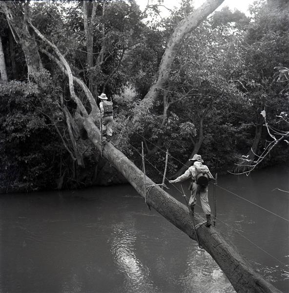 | Deux soldats traversant une large rivière sur un arbre abattu en travers. Le tronc a été équipé de rambardes et de cables |