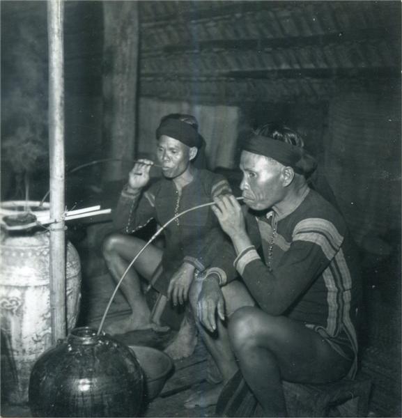 Deux hommes assis à l'intérieur d'une maison buvant à la jarre avec des chalumeaux. Une substance odoriférante brûle dans un réceptacle attaché à un poteau entre les jarres